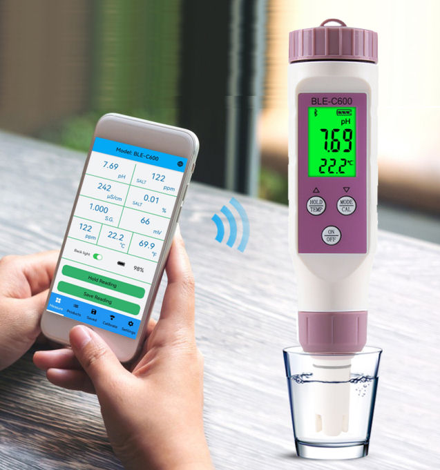 Chytrý kapesní měřič C600 7 v 1 ( pH, TDS, EC, ORP, Salinita, Specifická hmotnost, teplota) s Bluetooth...
