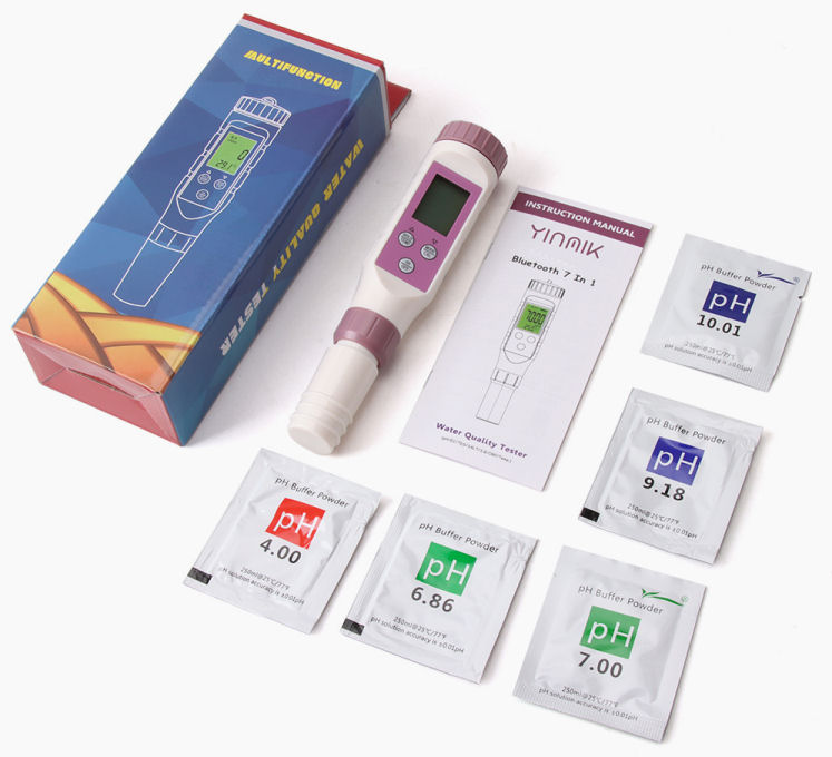 Kapesní měřič 7v1 pro měření parametrů vody v bazénech, akváriích, laboratořích, měření moči apod.Praktický malý měřič s podsvětleným LCD displejem a přenosem informací do chytého telefonu Android / iOS).
