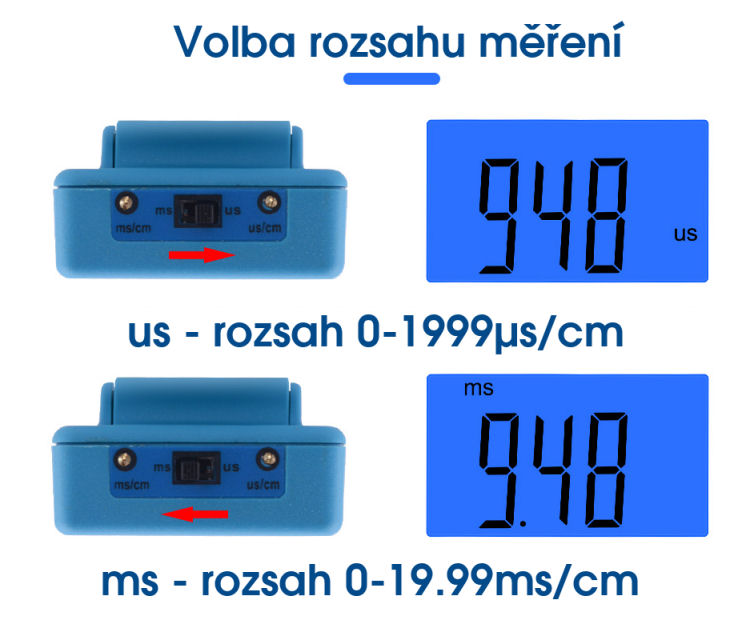 - rozsah: 0~1999µs/cm nebo 0~19.99ms/cm