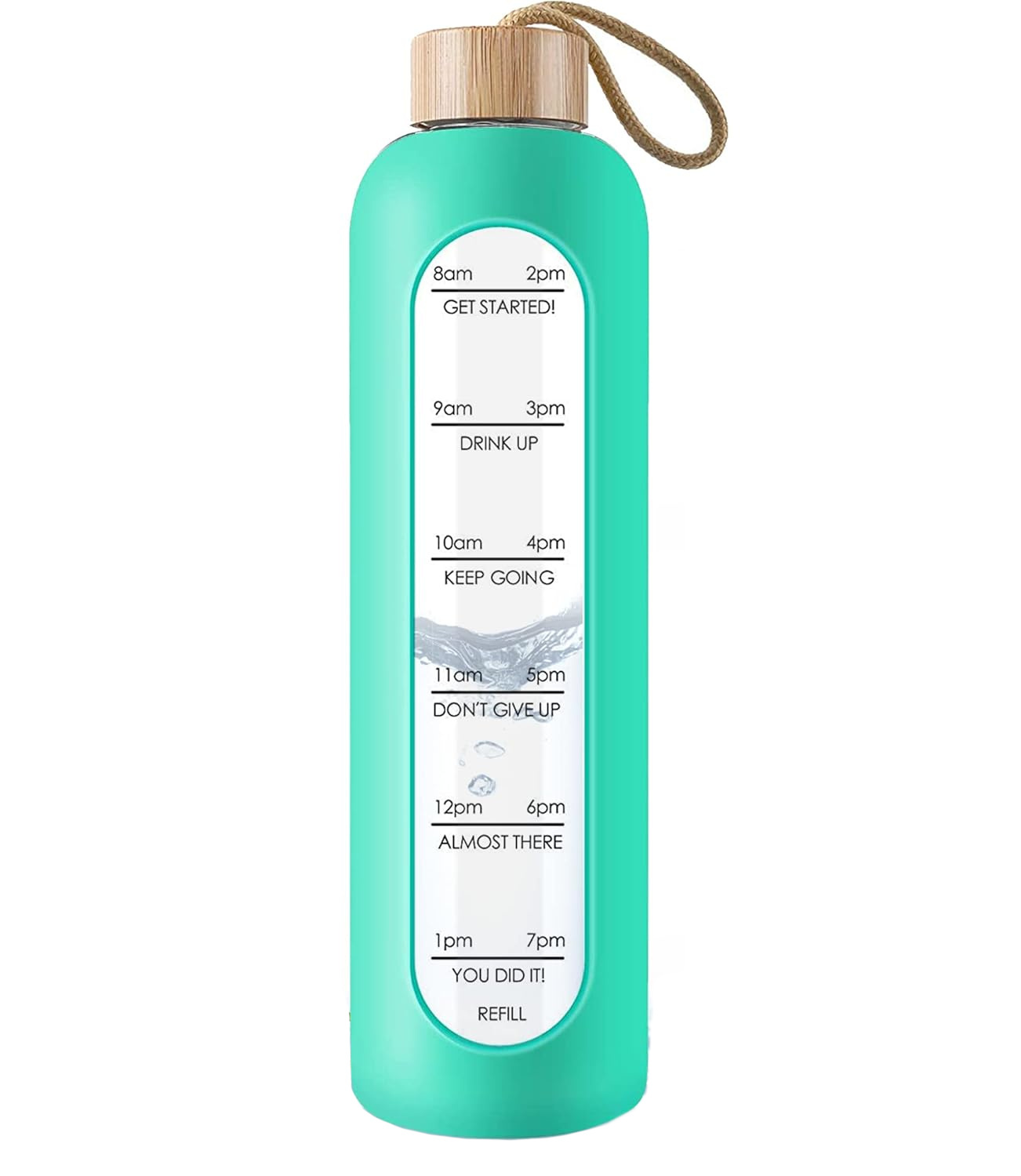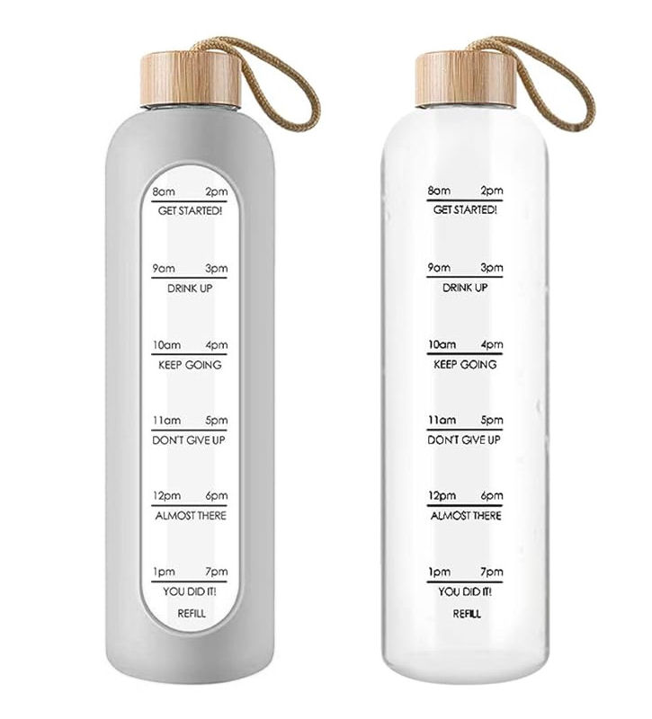 Motivační láhev na vodu o objemu 1l.Je vybavena praktickou odměrkou s časy (např. 8:00, 19:00) a motivačními slogany v angličtině, které vám pomohou zůstat hydratovaní po celý den.