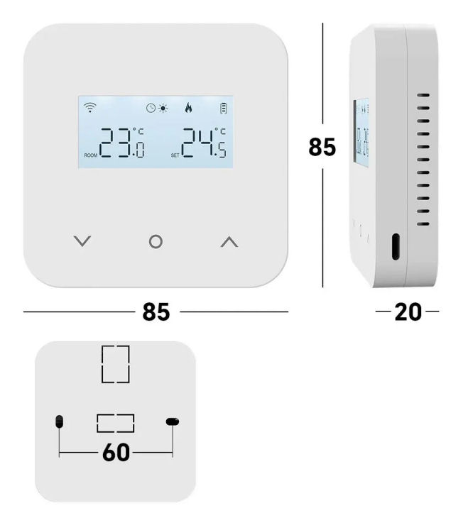 Digitální pokojový WiFi termostat. S interní i externím čidlem teploty. Možnost nastavení hlidání maximální teploty podlahy 5°C až 60°C.