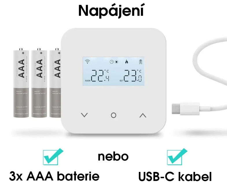 Napájení: 3xAAA 1.5V baterie nebo USB-C 5V