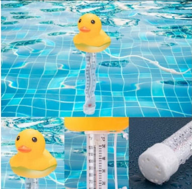 Plovoucí teploměr, slouží k měření teploty bazénové vody, doplněn provázkem k upevnění např. ke schůdkům