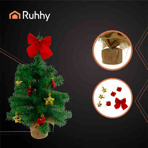 Stromeček je předem ozdobený šesti vánočními kouličkami a červenou mašlí, které ladí v klasických vánočních barvách – zelené, zlaté a červené.